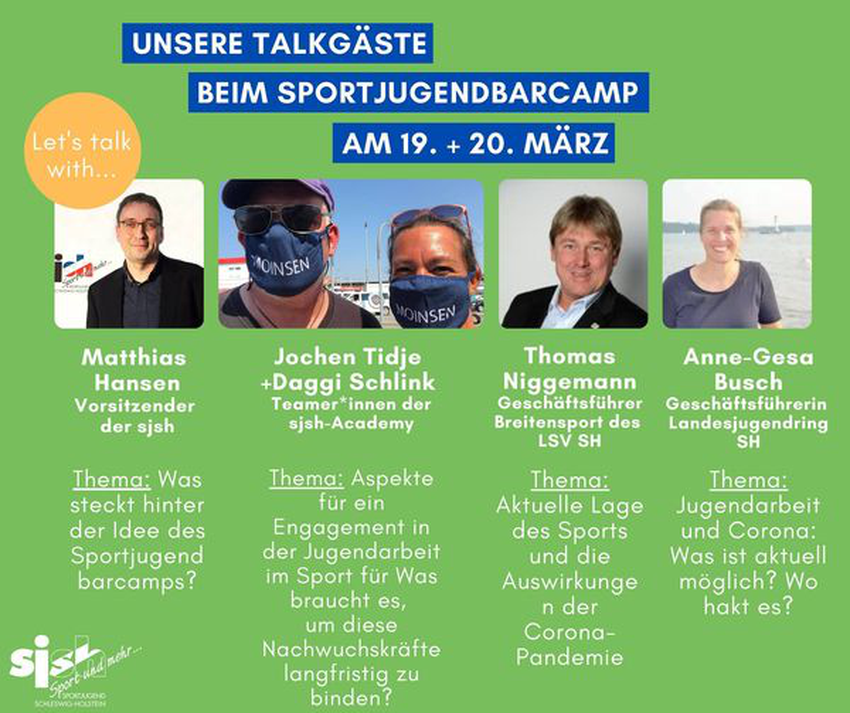 Zwischen den Sessions wird es beim #sportjugendbarcamp am Freitag und Samstag kurze Talkrunden geben. Mit diesen Gästen wird unser Moderator FOMtastisch über folgende Themen sprechen: