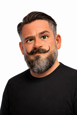 Trägt Haltung und Mustache.